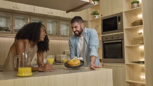 Em cozinhas, o revestimento PET é utilizado para criar armários e portas de gabinetes, resultando em superfícies lisas e brilhantes que são resistentes a manchas e fáceis de limpar.